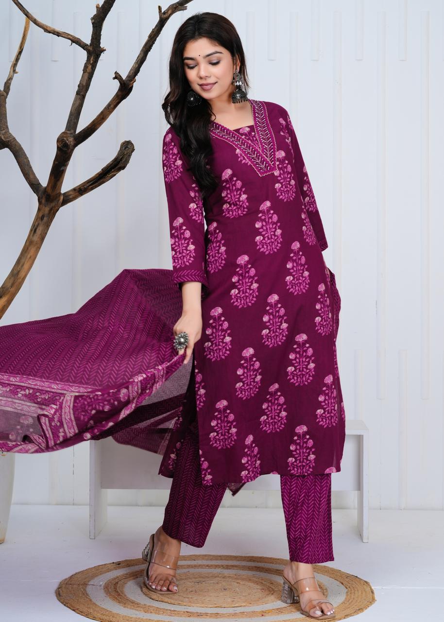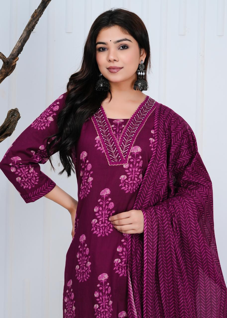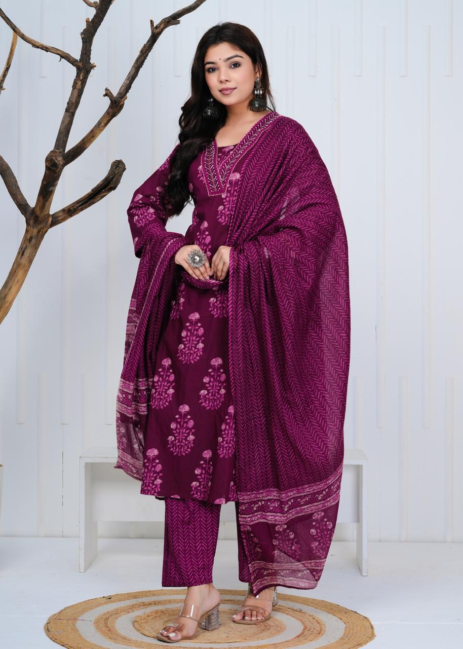 The rich plum-colored kurta features a striking motif of delicate floral patterns, with a beautifully detailed V-neckline adorned with intricate embroidery. The coordinating straight-cut pants echo the same block-printed design, creating a cohesive and chic look. The set is completed by a lightweight chiffon dupatta, showcasing a subtle chevron pattern and a complementary border, adding a touch of grace and movement.
