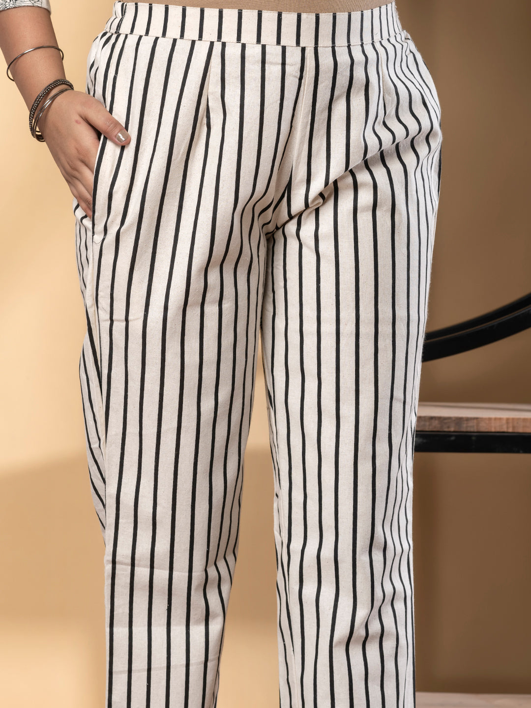 Experience classic style with a modern twist with these off-white straight pants featuring bold black vertical stripes. Designed for versatility, these pants offer a tailored yet relaxed silhouette that is flattering and comfortable for all-day wear. The elasticized waistband and handy side pockets add practical touches to the streamlined design, making them a go-to choice for both work and casual outings.
