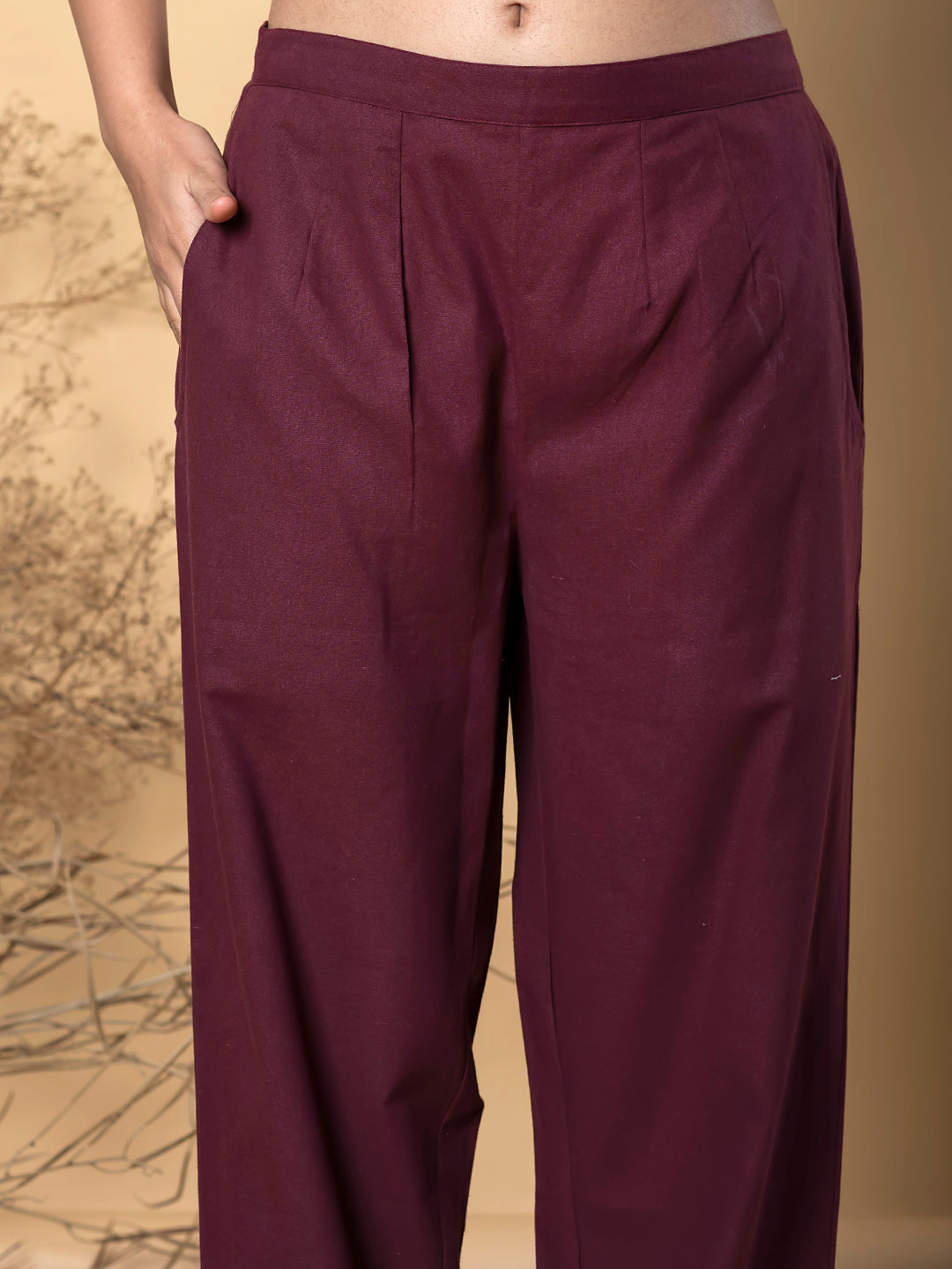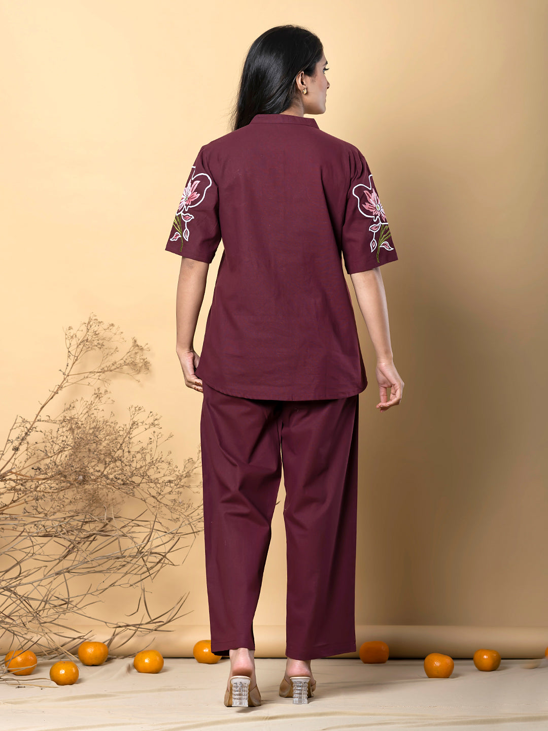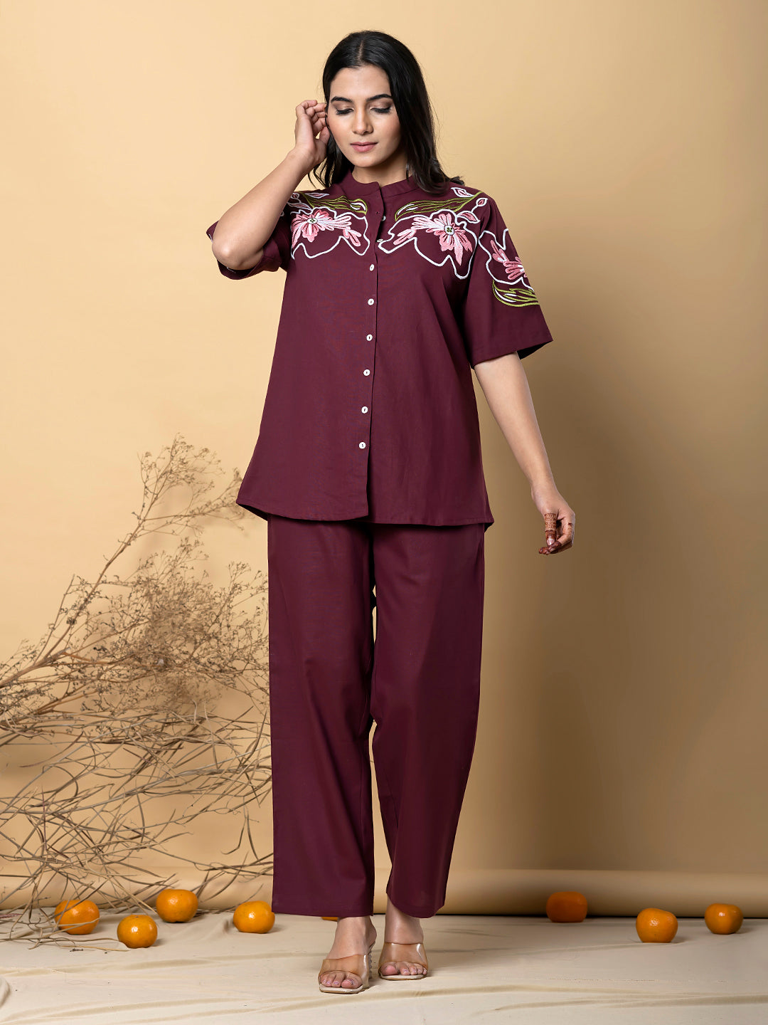 This set showcases a stylish two-piece co-ord suit in a rich maroon color with detailed floral embroidery, designed for both comfort and elegance.
